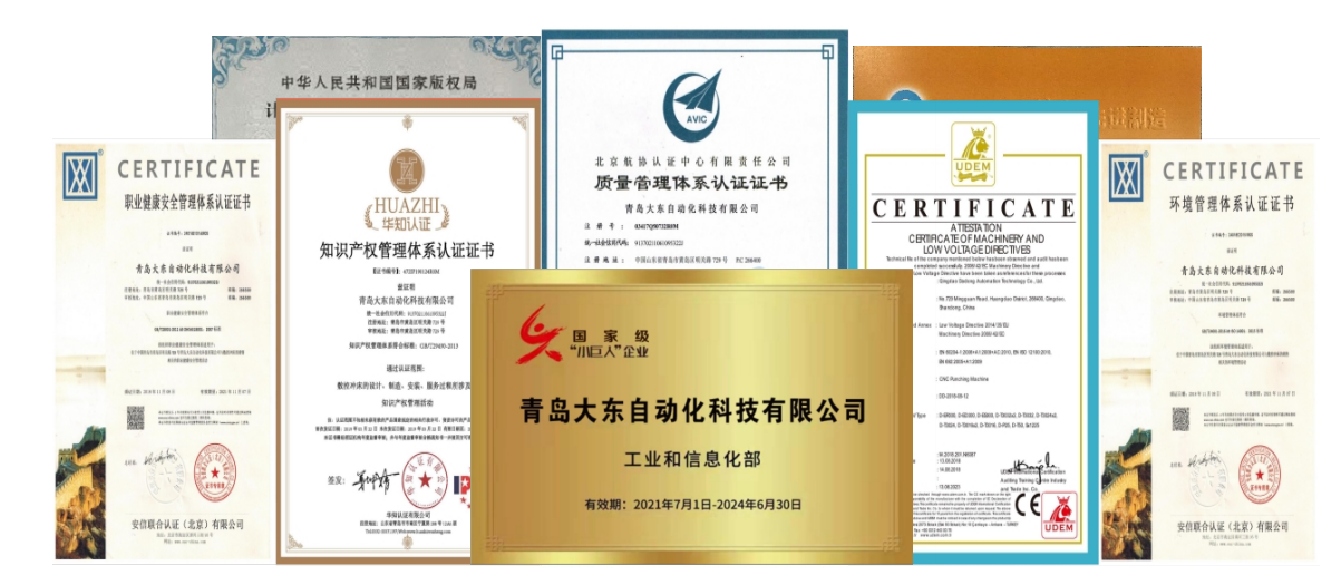 In 2016, the company passed the national high-tech enterprise certification, obtained the ISO9001 quality management system certification, environmental management system 14000, employee health and safety management system 18000, CE certification, high-speed CNC turret punch and servo turret punch were listed as Qingdao "specialized, special and new" products, in 2017 won the Qingdao Enterprise Technology Center, Mayor's Cup Intelligent Design Award, in 2018 it was rated as Qingdao famous brand, Langya list enterprise, Qingdao specialized, special and new demonstration enterprise. At present, it has more than 20 patented technologies. In 2018, it established industry-university-research cooperation agreements with Nanjing University of Science and Technology, Qingdao Institute of Military-Civil Integration and other institutions.